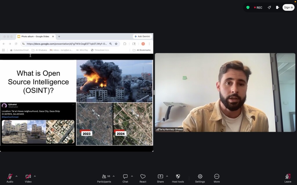 The event also benefited from the expertise of US Policy Fellow at al-Shabaka, Tariq Kenney-Shawa, who spoke about the use of OSINT (open-source intelligence) to hit back against Israeli disinformation.