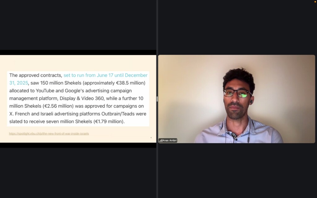 Last but not least, the organisers brought on the freelance investigative journalist Anas Ambri, who showed how Google’s Ads Transparency Centre and US Foreign Agent filings can be used to identify where money is being poured in order to forcefully push out state narratives.