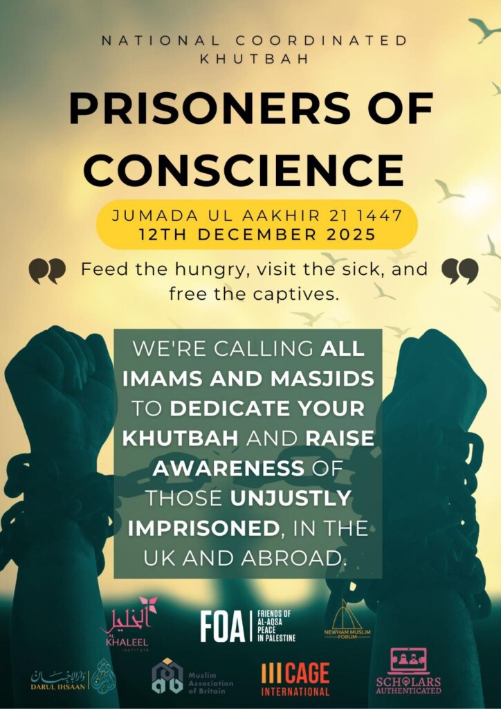 A broad coalition of organisations is urging Imams across the country to dedicate their Jumu’ah khutbah on 12 December to highlighting the plight of individuals who are unjustly and oppressively imprisoned around the world.